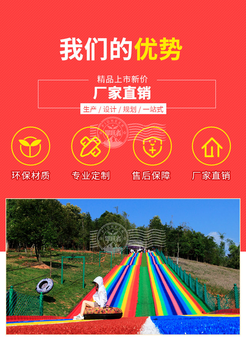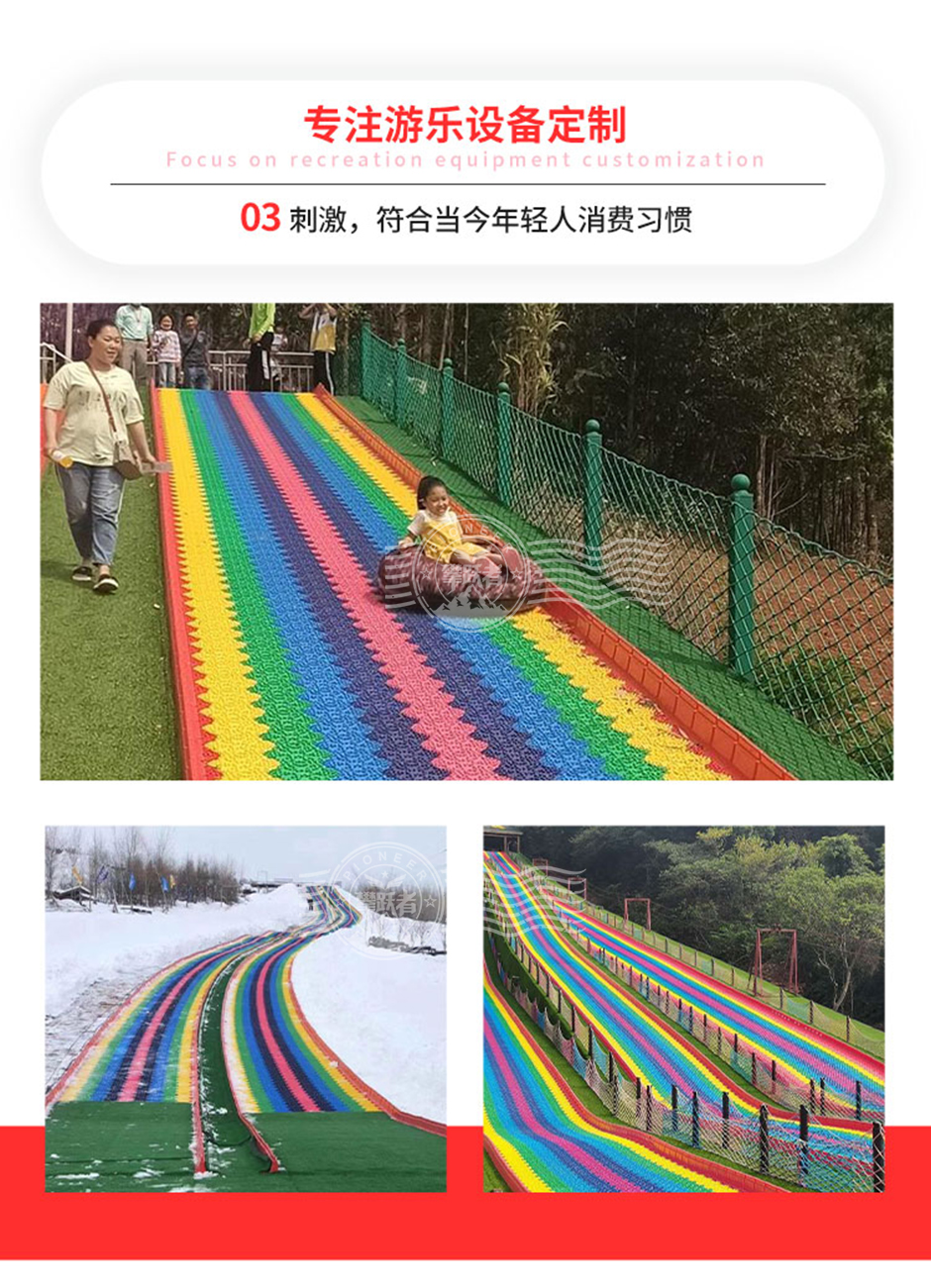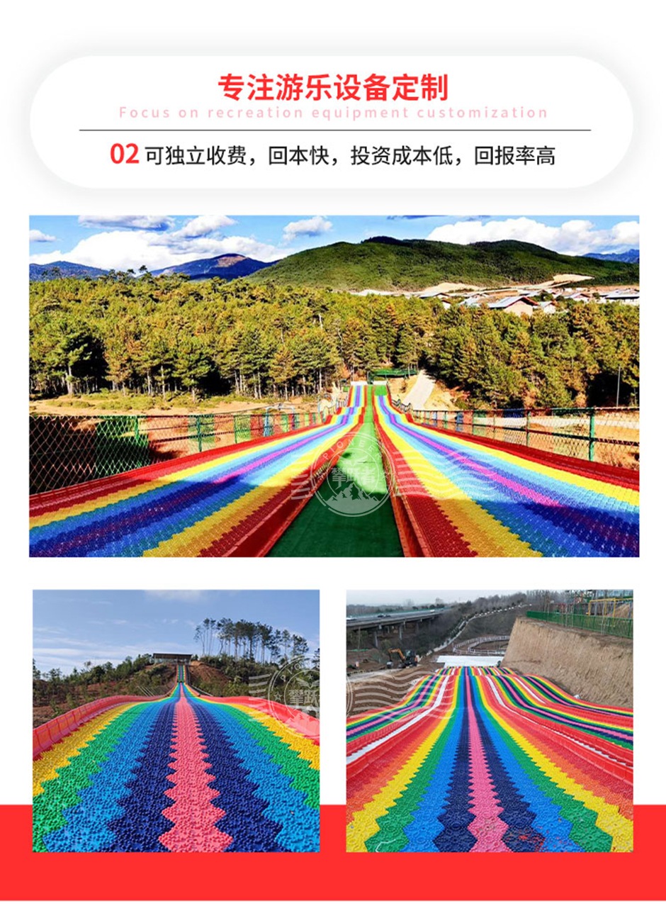 彩虹滑道由七種不同顏色的滑道組成,如紅、橙、黃、綠、藍(lán)、靛、紫等,色彩鮮艷亮麗,能夠吸引人們的目光?;揽梢愿鶕?jù)場(chǎng)地大小進(jìn)行定制,長(zhǎng)度和寬度靈活調(diào)整?。游客坐在特制的滑具上,從高處沿著滑道順勢(shì)而下。由于滑道有一定的坡度,借助重力作用,游客可以快速滑行,體驗(yàn)速度與激情。滑具通常設(shè)計(jì)得較為安全舒適,確保游客在滑行過(guò)程中保持穩(wěn)定。相比其他大型游樂(lè)設(shè)施,彩虹滑道的建設(shè)和運(yùn)營(yíng)成本相對(duì)較低,維護(hù)也較為簡(jiǎn)單。因此,它受到許多投資者的青睞,特別是在農(nóng)場(chǎng)和景區(qū)中,彩虹滑道因其投入成本低、回報(bào)快、工期短而成為熱門(mén)選擇?。